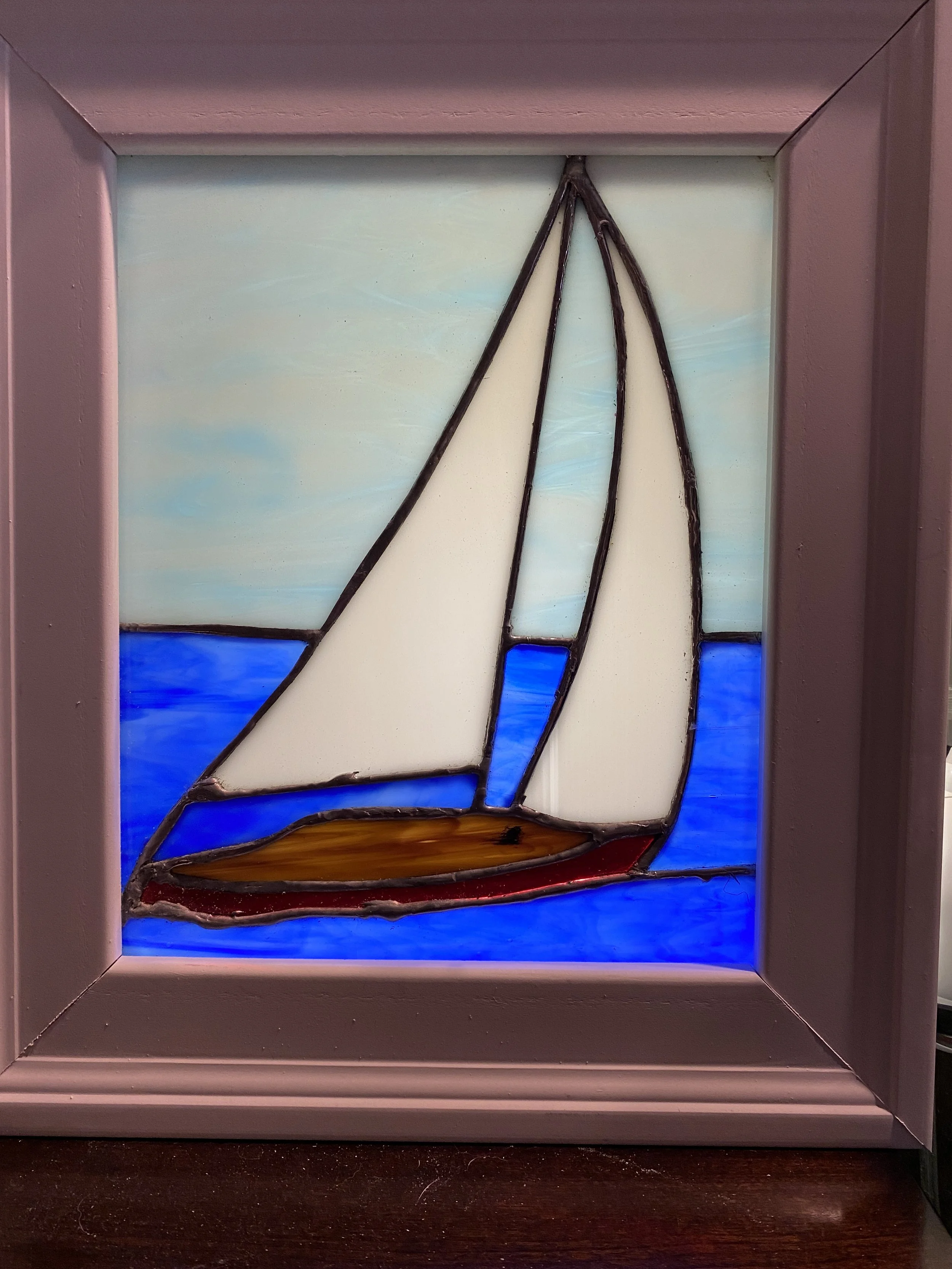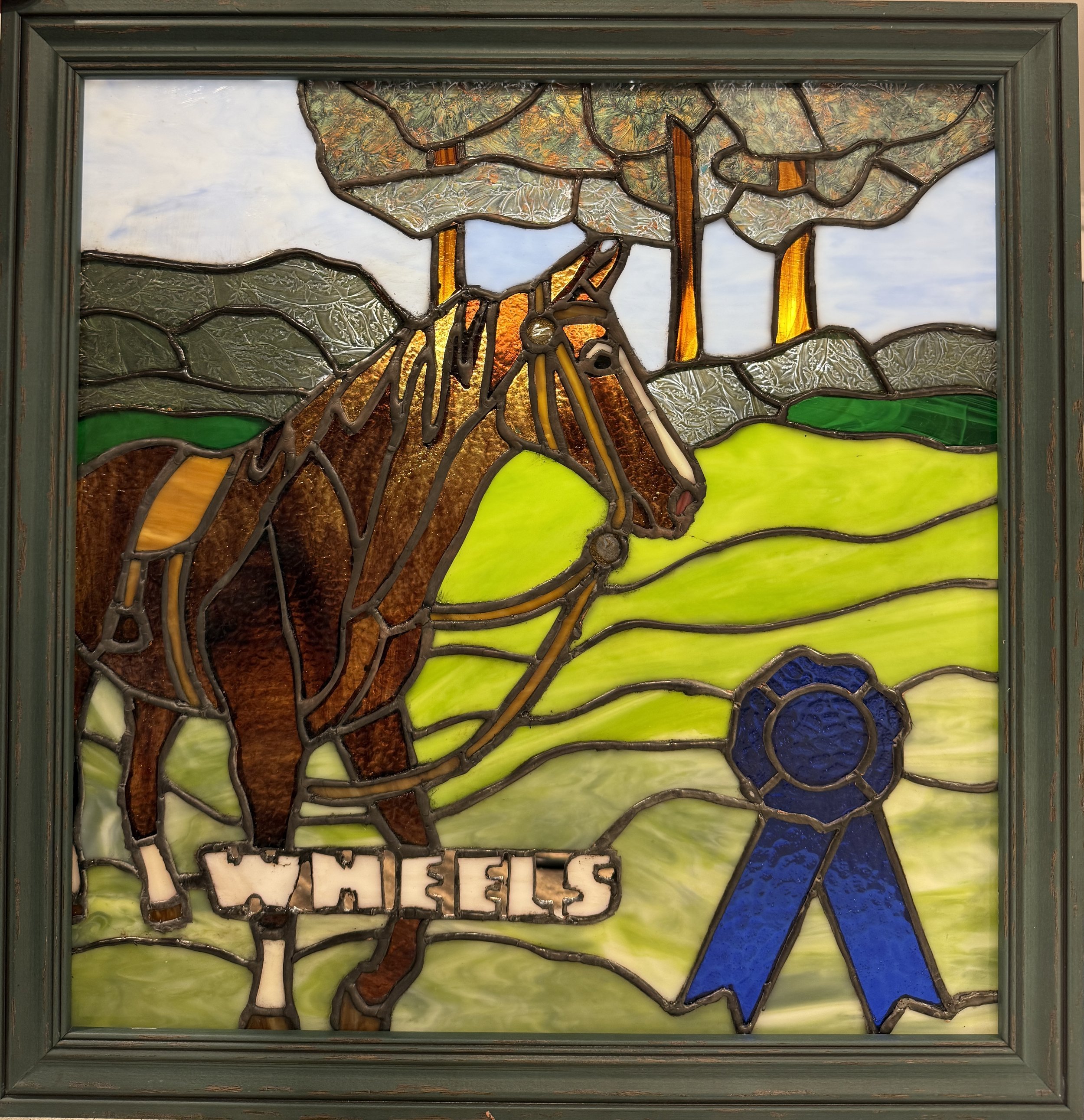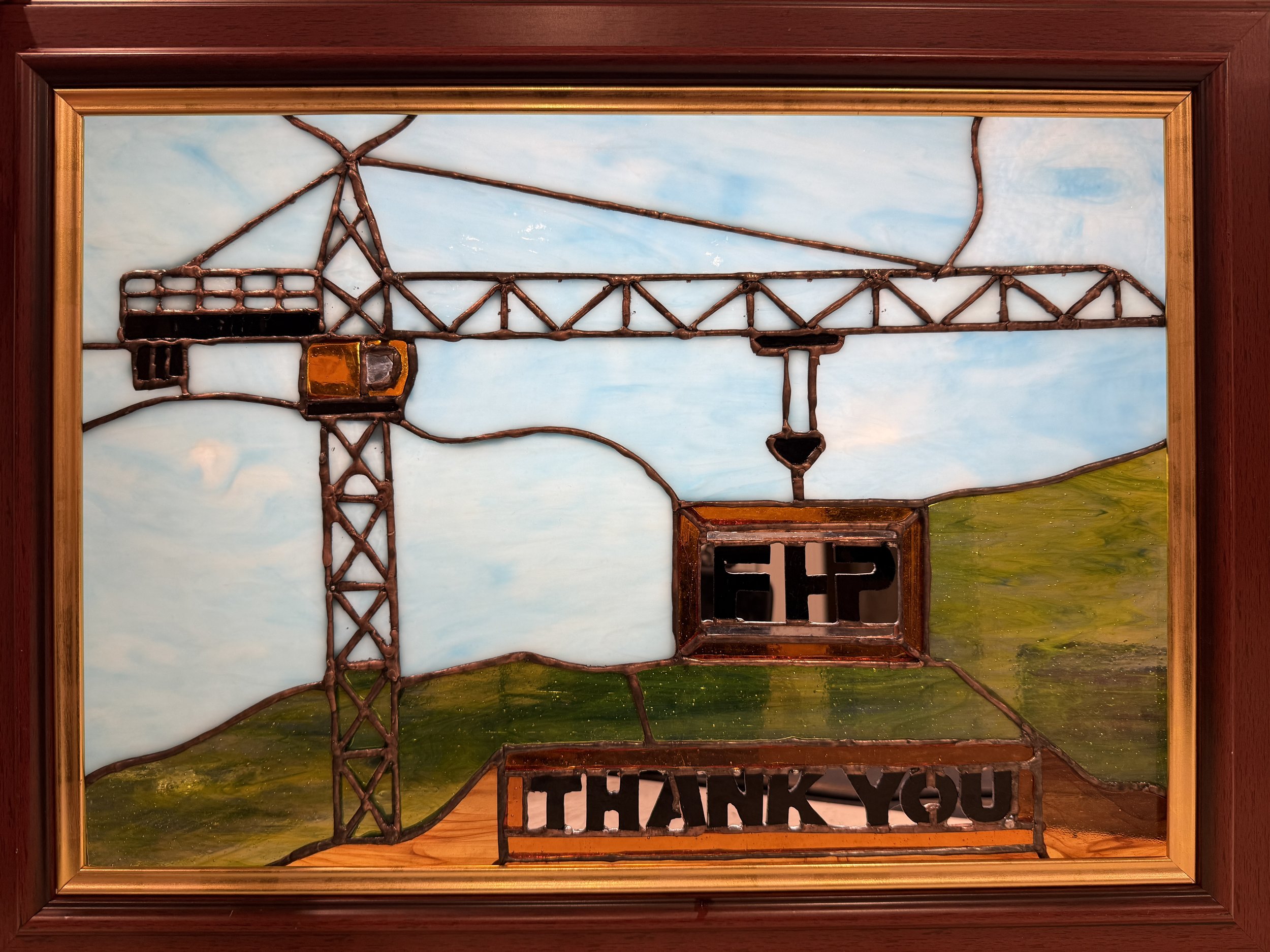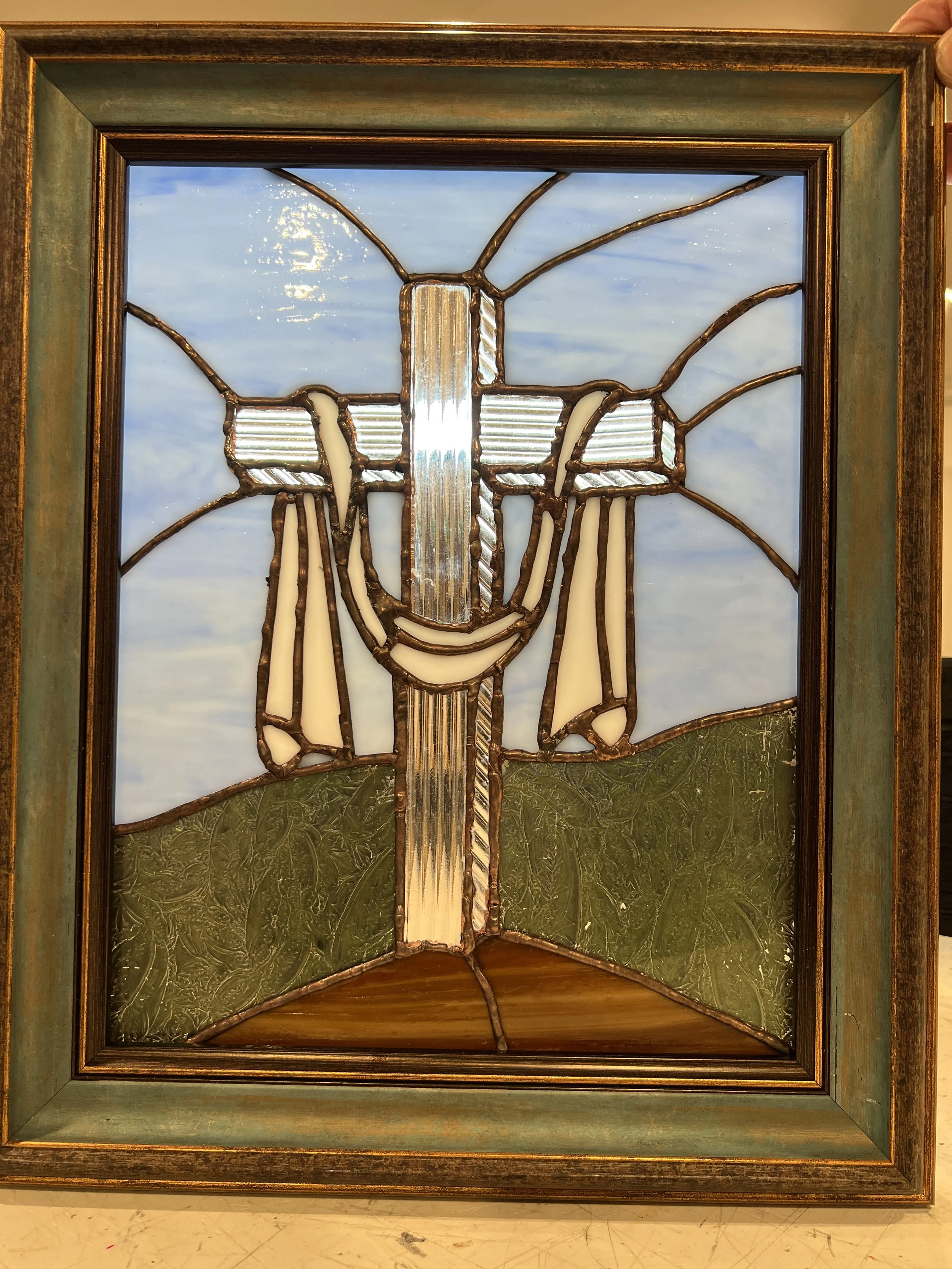 This was a gift for siblings who lost their Dad too soon. The setting sun, heart, and mountain scene represent the sunset of a life, love, and a family vacation spot that reminds them of their Dad, all placed in a window through which they can look, remember, and dream.
